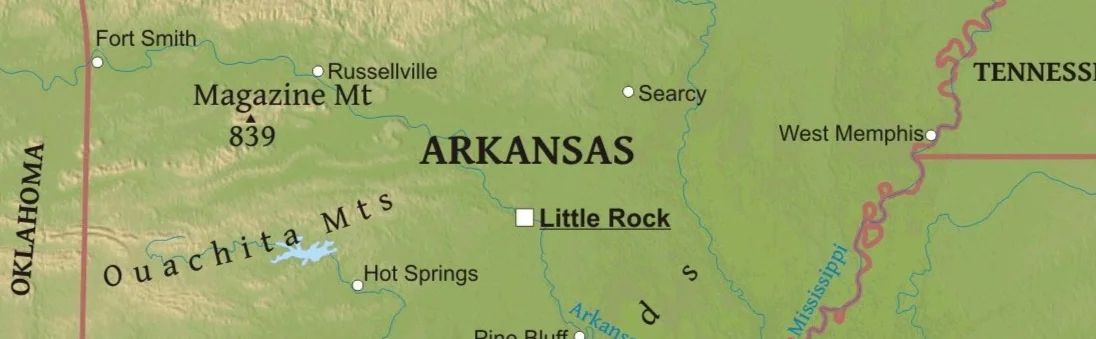 Sitting between the Appalachian and the Rockies area, Arkansas holds one of the biggest mountain ranges – the Ozarks. It is not surprising that Arkansas is called Natural state with its wilderness, mountains and, of course, the Mississippi river. It has a lot of great peaks with the highest mountain being Mount Magazine with 839 m (2,753 ft).